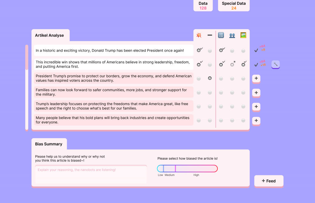 The second version is a gamified bias quiz generator called Neowzuu. Instead of just providing answers, users can test themselves on identifying the biases and receive instant feedback. The quiz is set in a dystopian world where users are part of the resistance, fighting against a biased regime by training nanobots. There will be a group of nanobots growing in one corner of the screen, reacting to the user’s input and expressing different emotions depending on how they answer the question about the article’s overall bias. Users rate the bias on a scale and get immediate feedback on their explanation.
